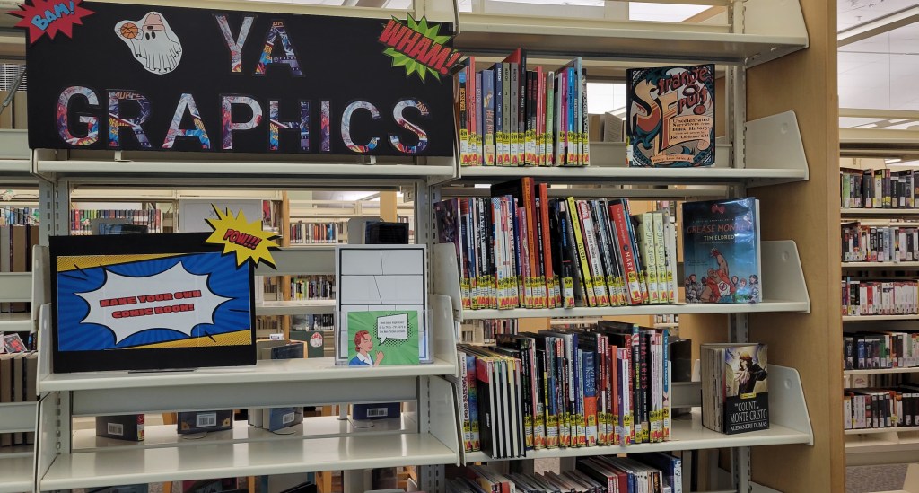 This is the YA Graphics Display I put up, per the Children’s Librarian’s request. I made the YA Graphics sign and the fun passive program called Make Your Own Comic Book.